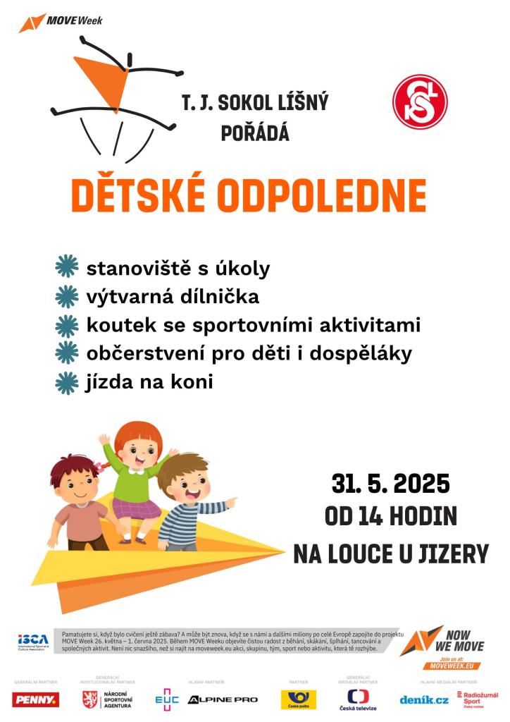 T.J. Sokol Líšný Vás zve v sobotu 31. května od 14 hodin na dětské odpoledne, které proběhne na louce u Jizery. Můžete se těšit na stanoviště s úkoly, jízdu na koni, občerstvení pro děti i dospělé a mnoho dalšího.