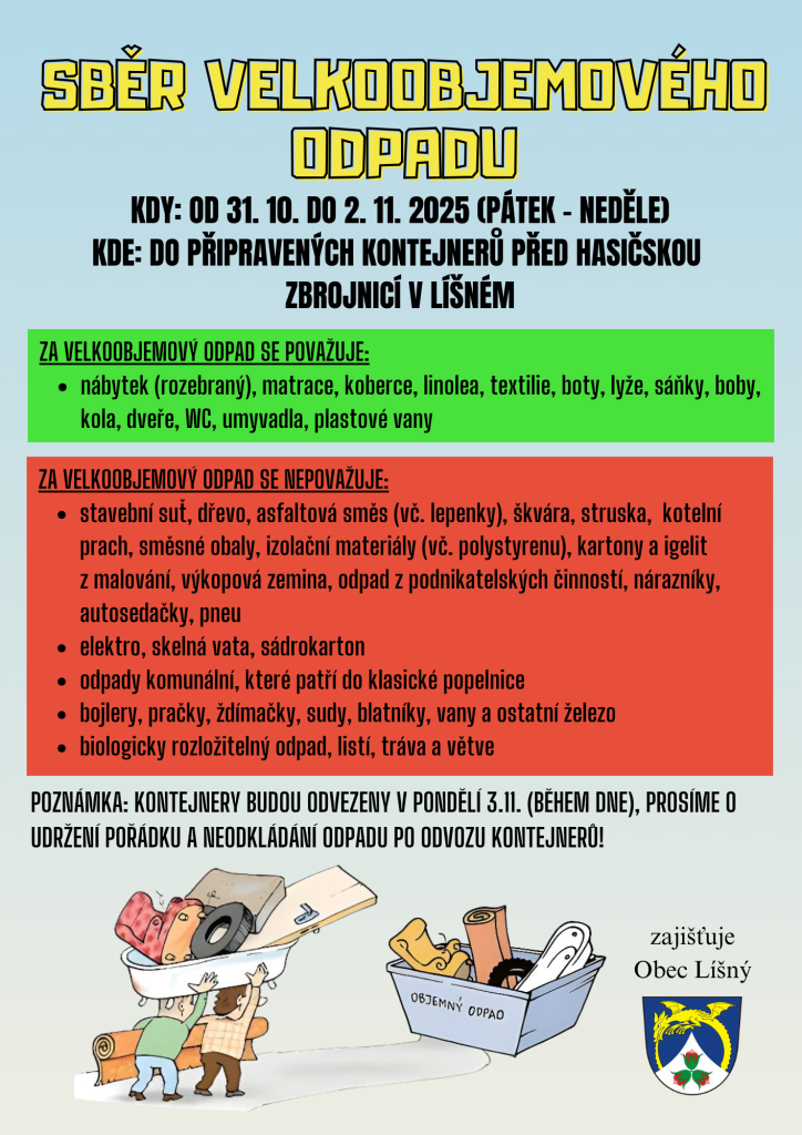 Pro občany obce Líšný proběhne od pátka 31. října do neděle 2. listopadu sběr velkoobjemového odpadu před hasičskou zbrojnicí. Bližší informace na plakátu.