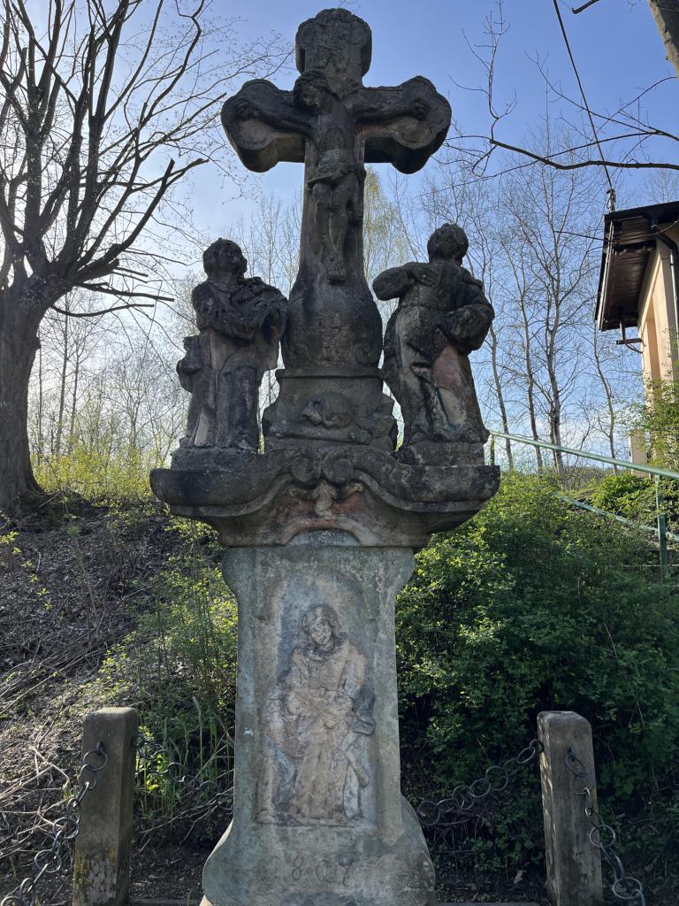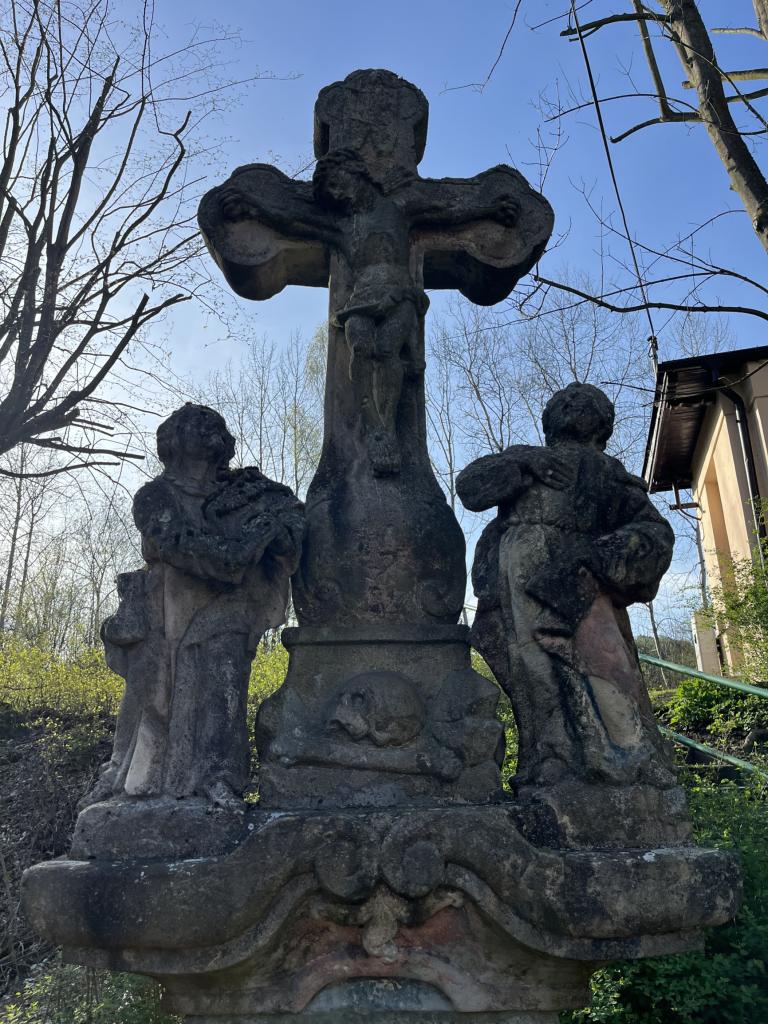 V horní části je na římse umístěn původně polychromovaný kříž zakončený třemi laloky a nesoucí tělo ukřižovaného Krista. Kříž je ve spodní části rozšířen a ozdoben symbolem hory Golgoty a lebkou se dvěma hnáty. Po stranách kříže jsou na samostatných podstavcích umístěny sochy Panny Marie a sv. Jana Evangelisty. Horní i dolní části jsou stejně vysoké - cca 190 cm.
