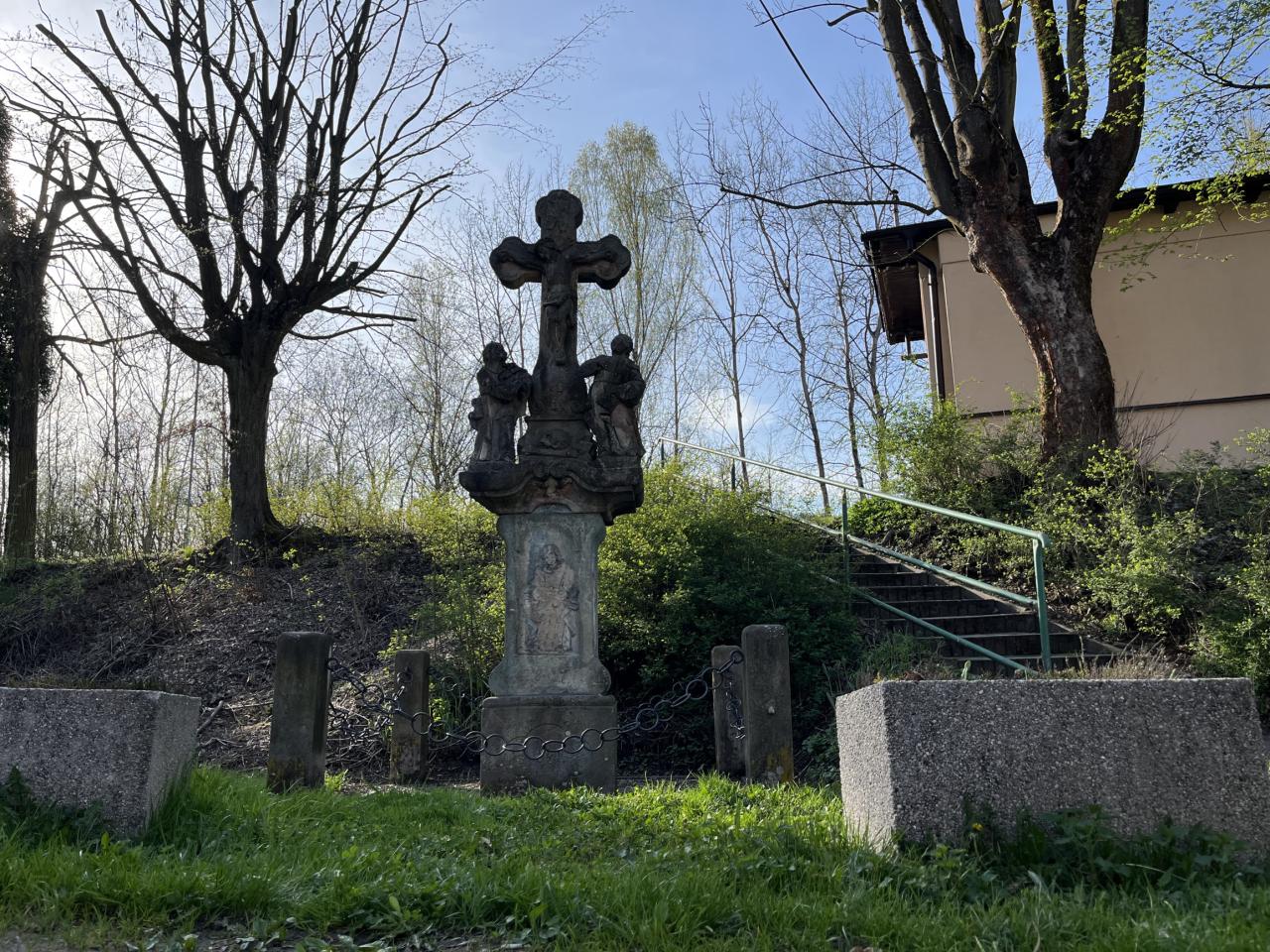 Pískovcový kříž s ukřižovaným Kristem a postavami Panny Marie a sv. Jana Evangelisty je osazený v obci Líšný před zastávkou železniční dráhy na pozemku pč. 120. Protože je celé sousoší vztyčeno z jediné římsy, jde o skutečnou Kalvárii (sochařské zobrazení Ukřižování, typicky krucifix doplněný postavami Panny Marie a sv. Jana stojícími pod křížem), která je zároveň takovým prostorovým uspořádáním unikátní i v rámci Jabloneckého okresu.